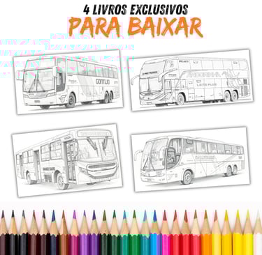 4 livros digitais prontos para imprimir, com desenhos incríveis de ônibus para todas as idades.”