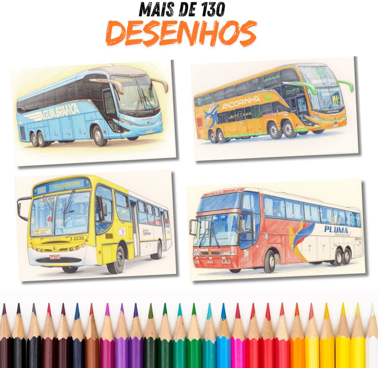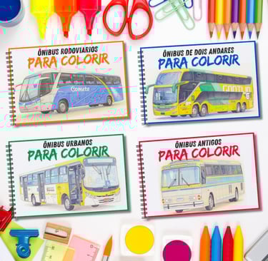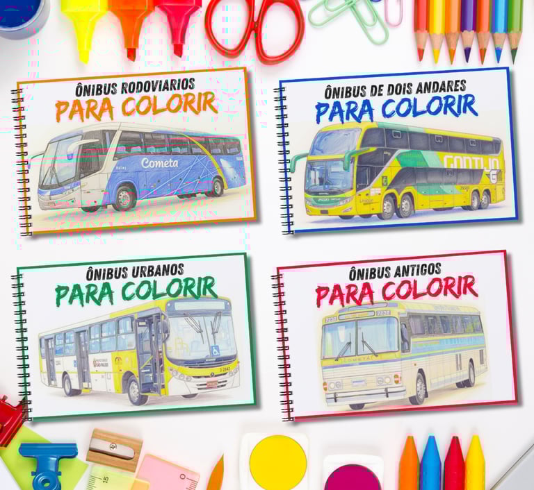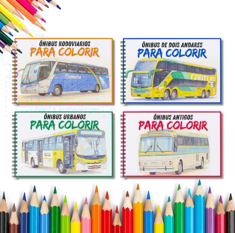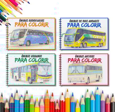 Um conjunto exclusivo com 4 livros temáticos cheios de desenhos realistas de ônibus — rodoviários, urbanos, antigos e até de dois andares!